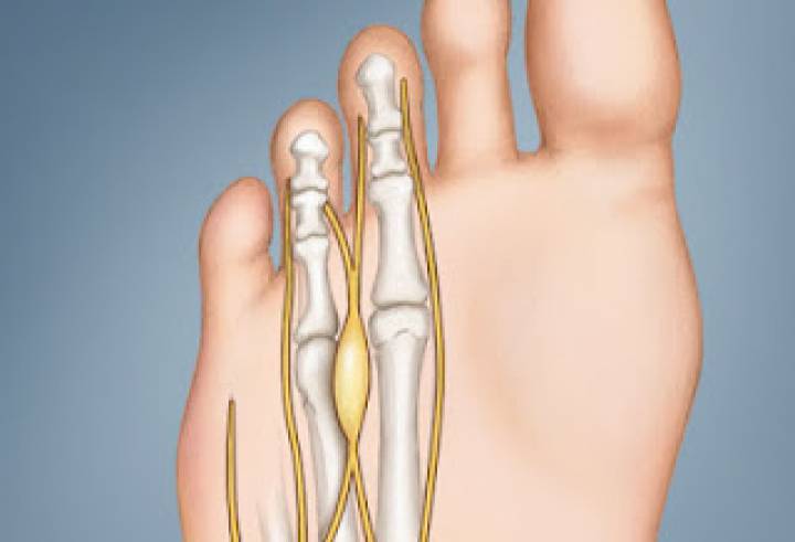 Tussen de beenderen, de spieren, ligamenten van de voorvoet bevinden er zich eveneens zenuwen. Door onder meer een doorzakken van de voorvoet kan zo'n zenuw gekneld raken tussen de twee beenderen (meestal de derde en vierde straal). De zenuw maakt daardoor een kleine spoelvormige verdikking, opzetting, een neurinoma wordt genoemd.